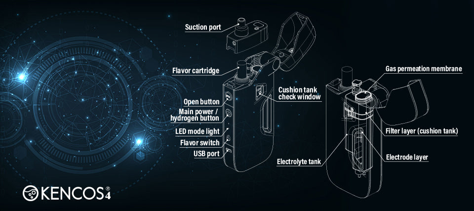 Dentro del tanque de KENCOS hay electrodos hechos de platino y titanio. Estos transportan la corriente eléctrica y los entregan a la solución líquida de electrólisis especialmente formulada. Esta solución contiene citrato de sodio y agua pura. El citrato de sodio está ahí simplemente para actuar como un conductor, que atrae la corriente eléctrica, que a su vez divide el agua pura en 66.6% de hidrógeno y 33.3% de oxígeno. A medida que respira a través de la boquilla de la unidad, está respirando directamente este gas hacia los pulmones.
